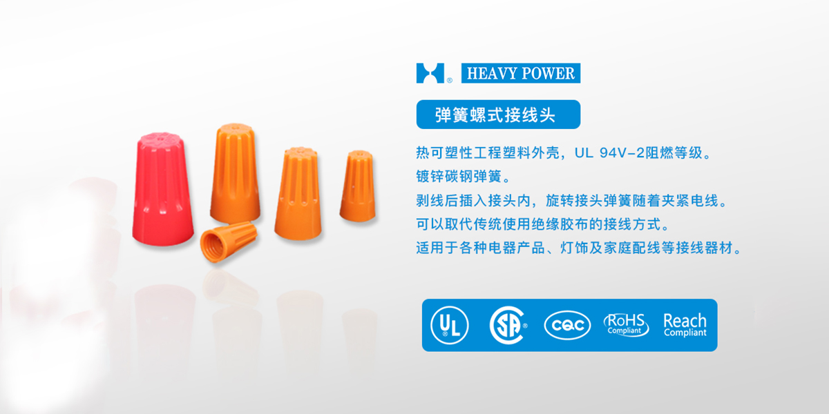1.熱可塑性工程塑料成型外殼,UL 94V-2阻燃等級(jí)。2.鍍鋅碳鋼彈簧。3.電線剝線后插入接頭內(nèi),旋轉(zhuǎn)接頭,彈簧隨著夾緊電線。4.可以取代傳統(tǒng)使用絕緣膠布的接線方式。5.適用于各種電器產(chǎn)品、燈飾及家庭配線等接線器材。6.多色可選。