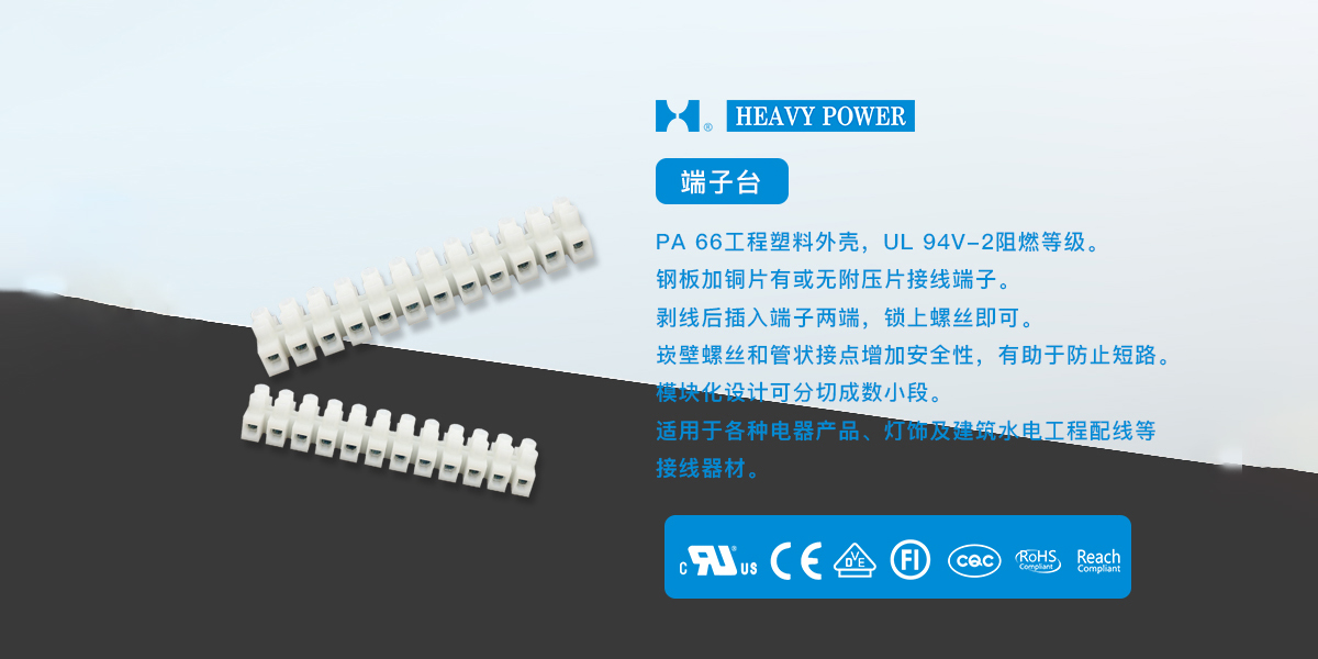 一、端子臺(tái)產(chǎn)品特點(diǎn)1.PA 66工程塑料外殼,UL 94V-2阻燃等級(jí)。2.鋼板加銅片有或無附壓片接線端子。3.剝線后插入端子兩端,鎖上螺絲即可。4.嵌壁螺絲和管狀接點(diǎn)增加安全性,有助于防止短路。5.模塊化設(shè)計(jì)可分切成數(shù)小段。6.適用于各種電器產(chǎn)品、燈飾及建筑水電工程配線等接線器...