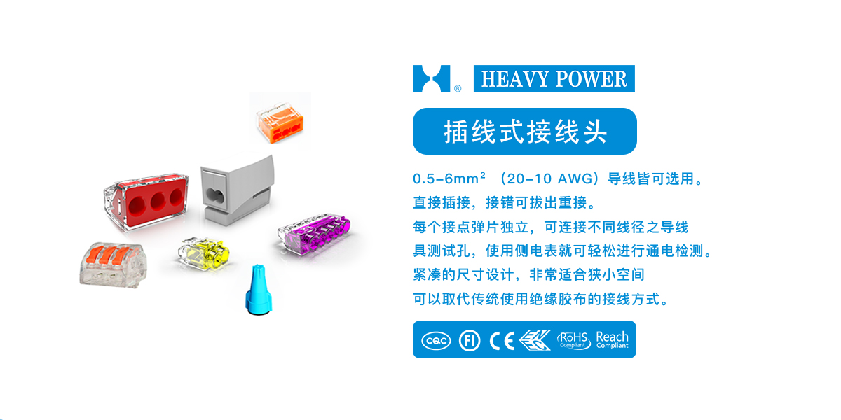 一、插線式接線頭產(chǎn)品特點(diǎn)1.0.5-6mm2(20-10 AWG)導(dǎo)線皆可選用。2.直接插接, 接錯(cuò)可拔出重接。3.每個(gè)接點(diǎn)彈片獨(dú)立,可連接不同線徑之導(dǎo)線。4.具測試孔,使用側(cè)電表就可輕松進(jìn)行通電檢測。5.緊湊的尺寸設(shè)計(jì),非常適合狹小空間。6.可以取代傳統(tǒng)使用絕緣膠布的接線方式。